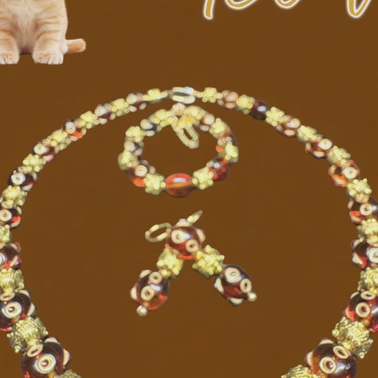Golden tiger’s eye takes center stage, flanked by molten amber glass and gilded texture that gleams like a predator in low light. Each bead glows with that sleek, unstoppable confidence — the kind that stalks, strikes, and owns every room.