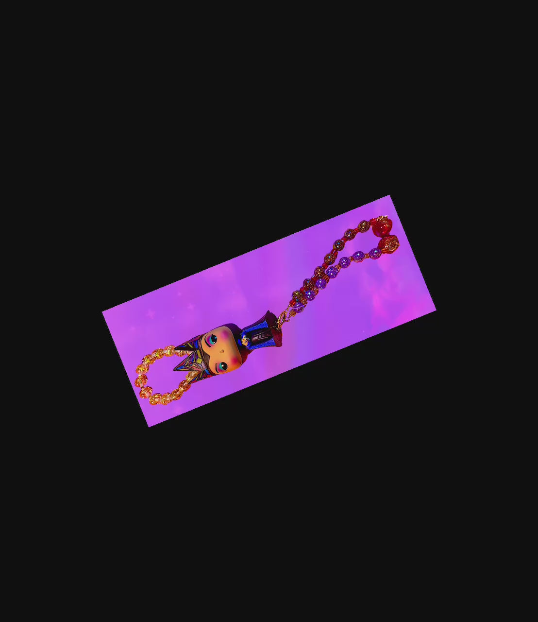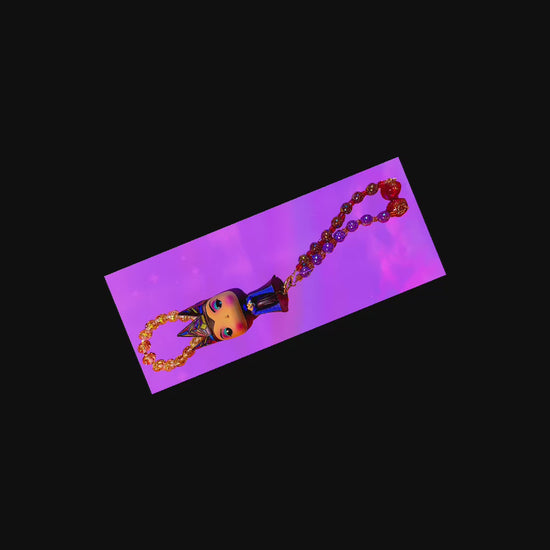 With a gleaming villainess centerpiece radiating dark elegance, this piece drips with royal menace and sparkle. The chain is stacked with fiery gold filigree beads, shimmering cosmic purples, and deep molten reds that end in two bold, blazing orbs — the kind of detail you don’t see on mass-produced charms. This isn’t “cute accessorizing.” This is Big Bead Energy for your bag, your keys, your life — a declaration that you don’t carry basic.