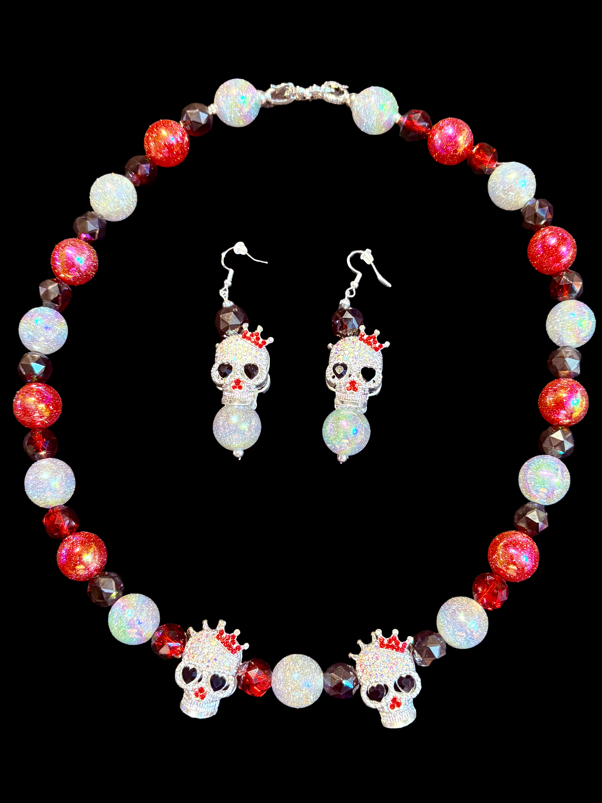 Glittering crowns, sparkling skulls, and a bead lineup that mixes blood-red shimmer, midnight facets, and icy holographic orbs — this isn’t just jewelry, it’s a declaration. The necklace doubles down with twin crowned skull pendants, while the matching earrings make sure no one misses the message: power, edge, and fearless style.